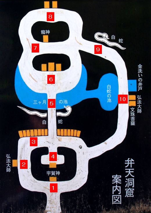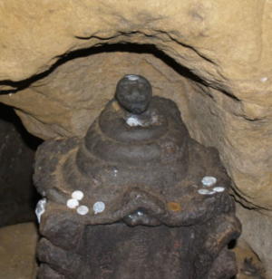 1 洞窟入口からまっすぐ10m位進むとつきあたりにへこんだ部分があり、宇賀神と書かれています。