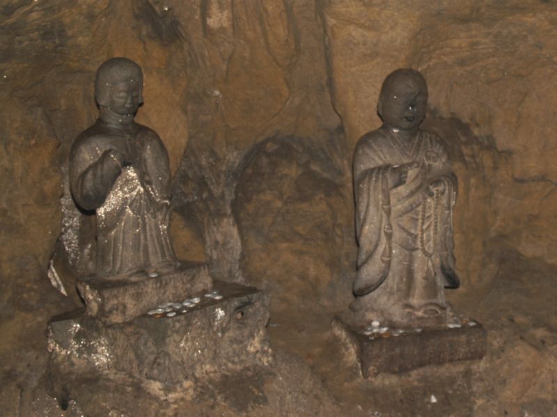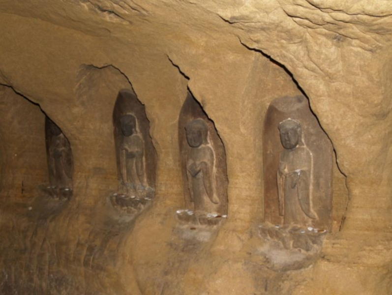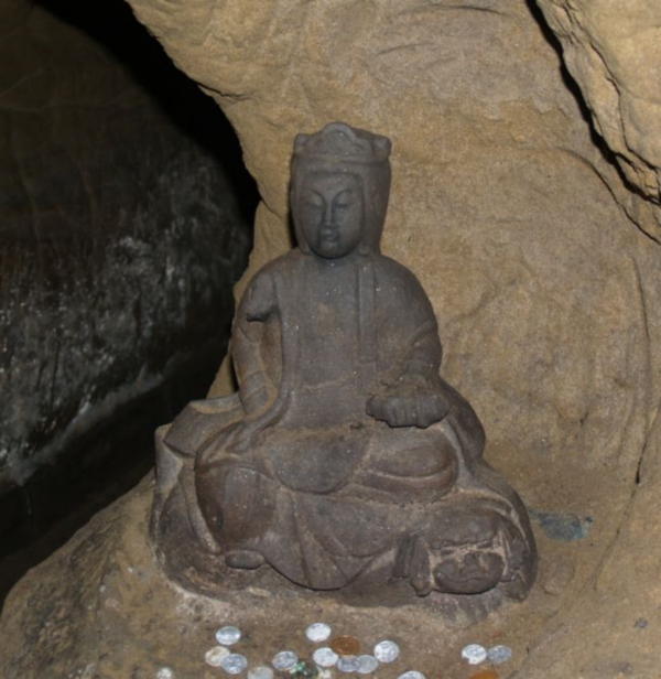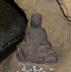 洞窟は横穴式の古墳をもとに掘り広げられたもので、入口付近は1500年以上前の状態で残されているといい、洞窟内には23体の石仏や金洗いの井戸、三日月の池、大蛇の彫刻などがあります。 |