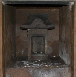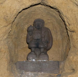 後ろの壁には階段が彫られています。上がっていくと中二階のようになっていて、中がくり抜かれた空洞になっています。そして正面の壁に大黒様が居られます。