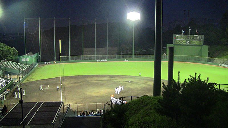 ナイター照明に映える緑の芝生 試合終了後(午後7時半)の様子