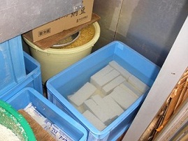 ご主人は豆腐の原料である大豆は生き物だとお話されていました。 大豆のふやかし具合がお豆腐の出来に影響してくるので、気温によって大豆を漬ける時間を変えていかなければなりません。 |