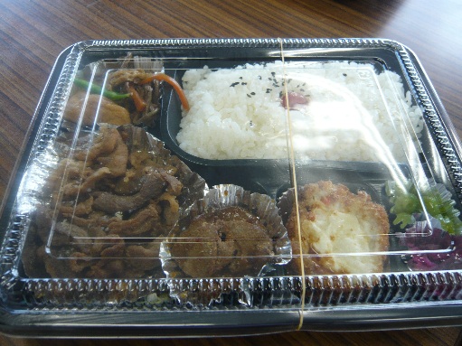 取材日のサービス弁当、生姜焼き弁当。