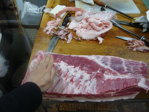 写真は特別に見せていただいた、スペアリブ用の豚肉の塊。