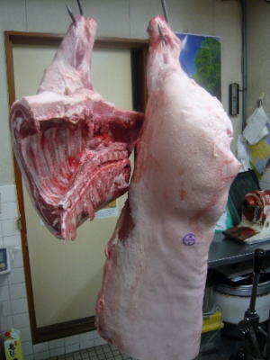 特に商品のキモである豚は、まるごと一頭入荷している。(左側:上半身 右側:下半身)
