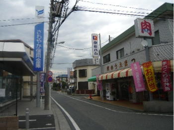会社を通り過ぎて真っ直ぐ進めば、左手に青い 『さわやか信用金庫』の看板、右手に大きな『肉』の看板が見えてきます。