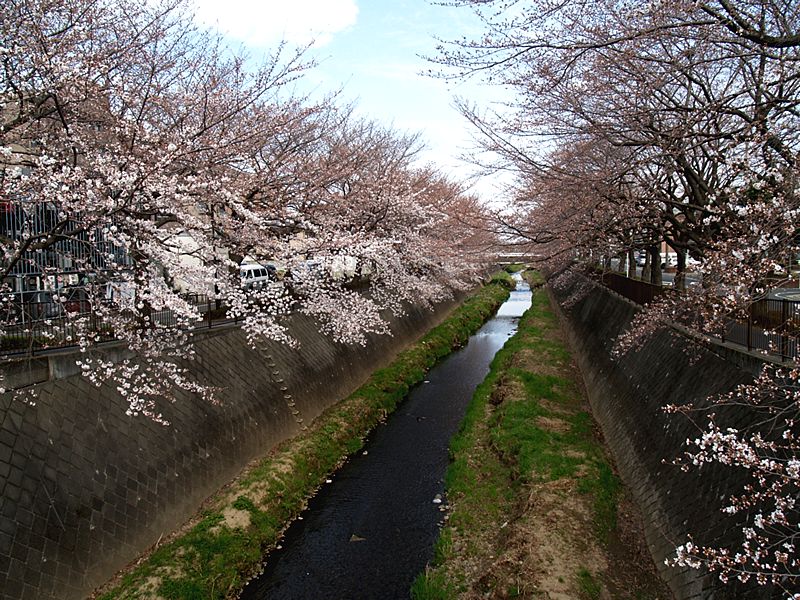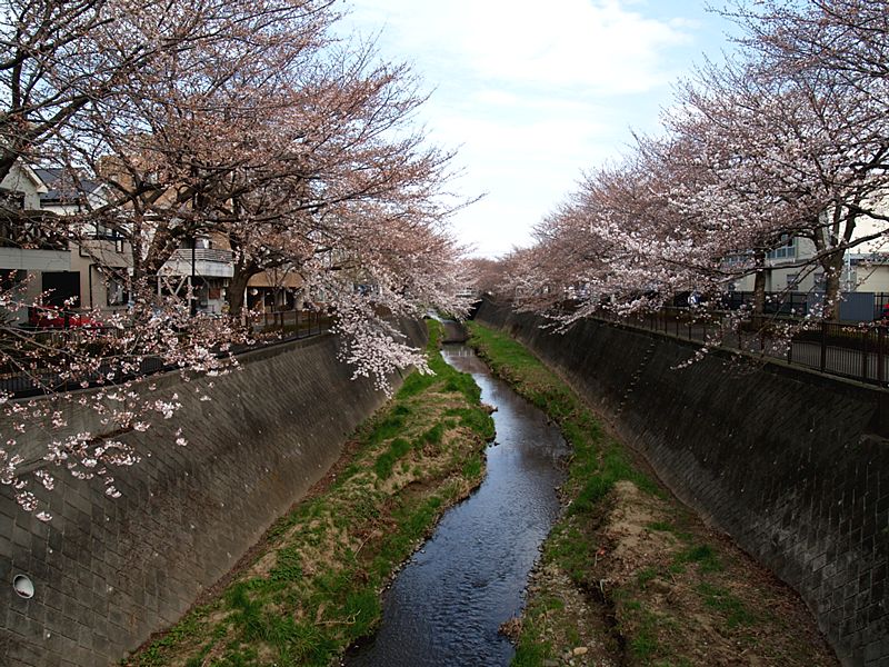稲城の桜の名所になった感があります三沢川沿いの遊歩道の桜も、ご覧の通り三分咲きです。