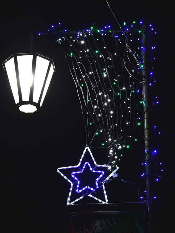 商店会街路灯のイルミネーション飾りが本年度バージョンに衣替えしました。 今年はいつになくアーティスティックで、こんな星の模様が描かれています。 小池電機商会の若い人総出で2,3日かけて出来上がった力作です。 少しでも道行く人を楽しませる事が出来れば良いですね。 |