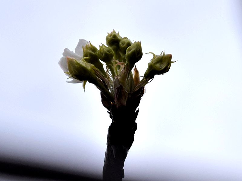 帰り道、硬い蕾のままの梨の木の中に一つだけ咲いた梨の花を見つけました。