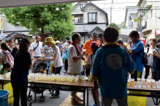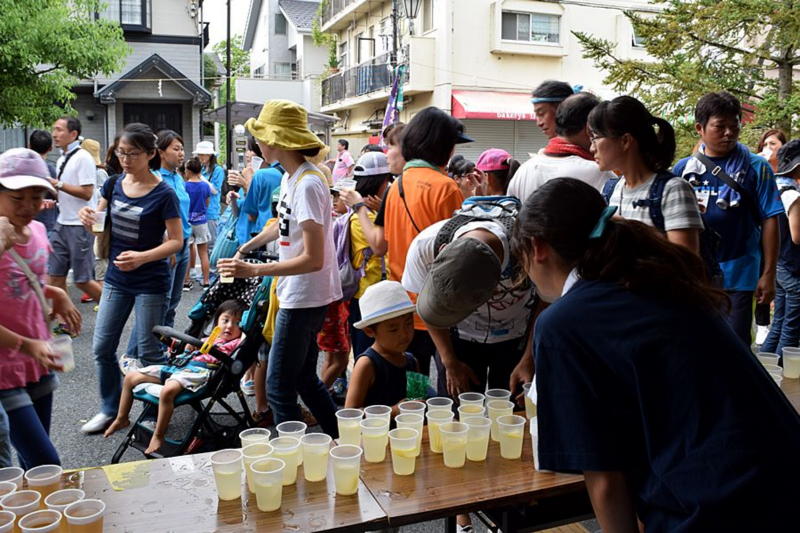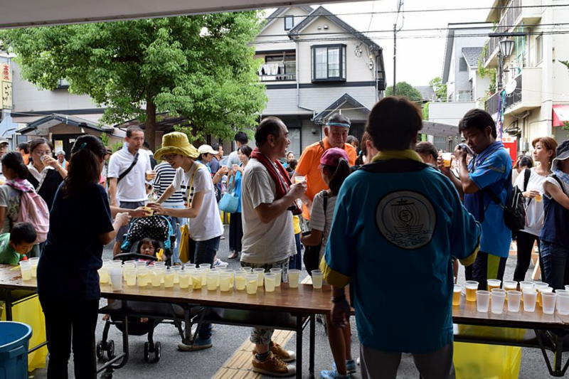 弁天通り商店会では、例年通り矢の口幼稚園前庭をお借りして御旅所を設け、子供達にはお菓子と冷たい飲み物を、担ぎ手の皆さんには御寿司をはじめとした料理とビール、レモン水、麦茶などで鋭気を養って頂きました。