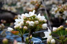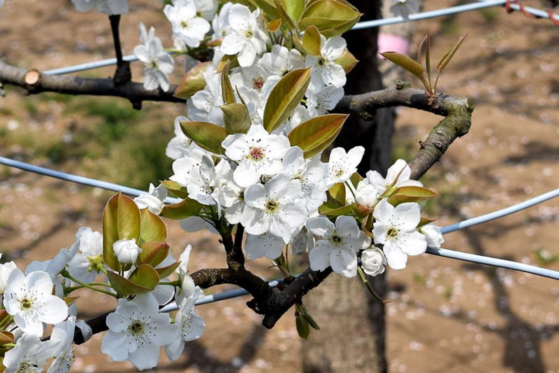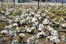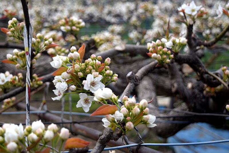 梨の花も、まだ蕾の木が多い中、すでに5分咲きの畑もあるようです。