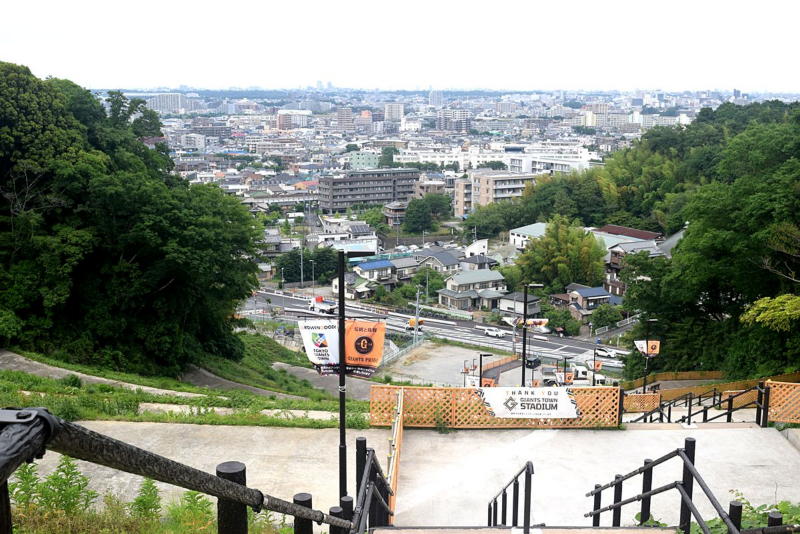 上りきるとスタジアムは目の前にありますが、横断歩道がありません。左右の横断歩道までかなりの距離がありますが、良い子はちゃんと迂回しましょう。
